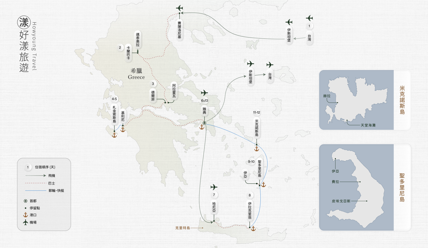 今日搭乘班機飛往希臘 賽薩洛尼基,準備好跟著我們一起徜徉在細白沙灘與碧海藍天、漫步在最值得一遊的島嶼、來場不受限的自主漫遊、精心安排的私房景點直擊、享受著每秒每分更有想像力的漾旅嗎? 相信這15天的希臘深度旅遊,一定是一場讓心靈深受感動的自然美景、文化饗宴和冒險之旅。