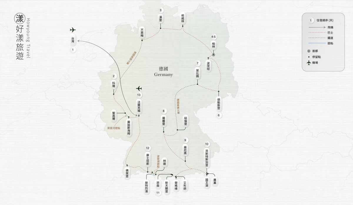 今日搭乘班機飛往德國,準備好跟著我們一起探索這片充滿歷史底蘊與文化魅力的國度吧! 從南德的童話城堡與阿爾卑斯山麓,到北德的浪漫大道與世界遺產古城,我們將穿梭於中世紀小鎮街巷,感受音樂、啤酒與藝術交織的生活節奏。相信這15天的德國深度旅程,將是一場結合文化、人文與自然的精彩饗宴,帶您體驗最道地、最迷人的德意志風華。