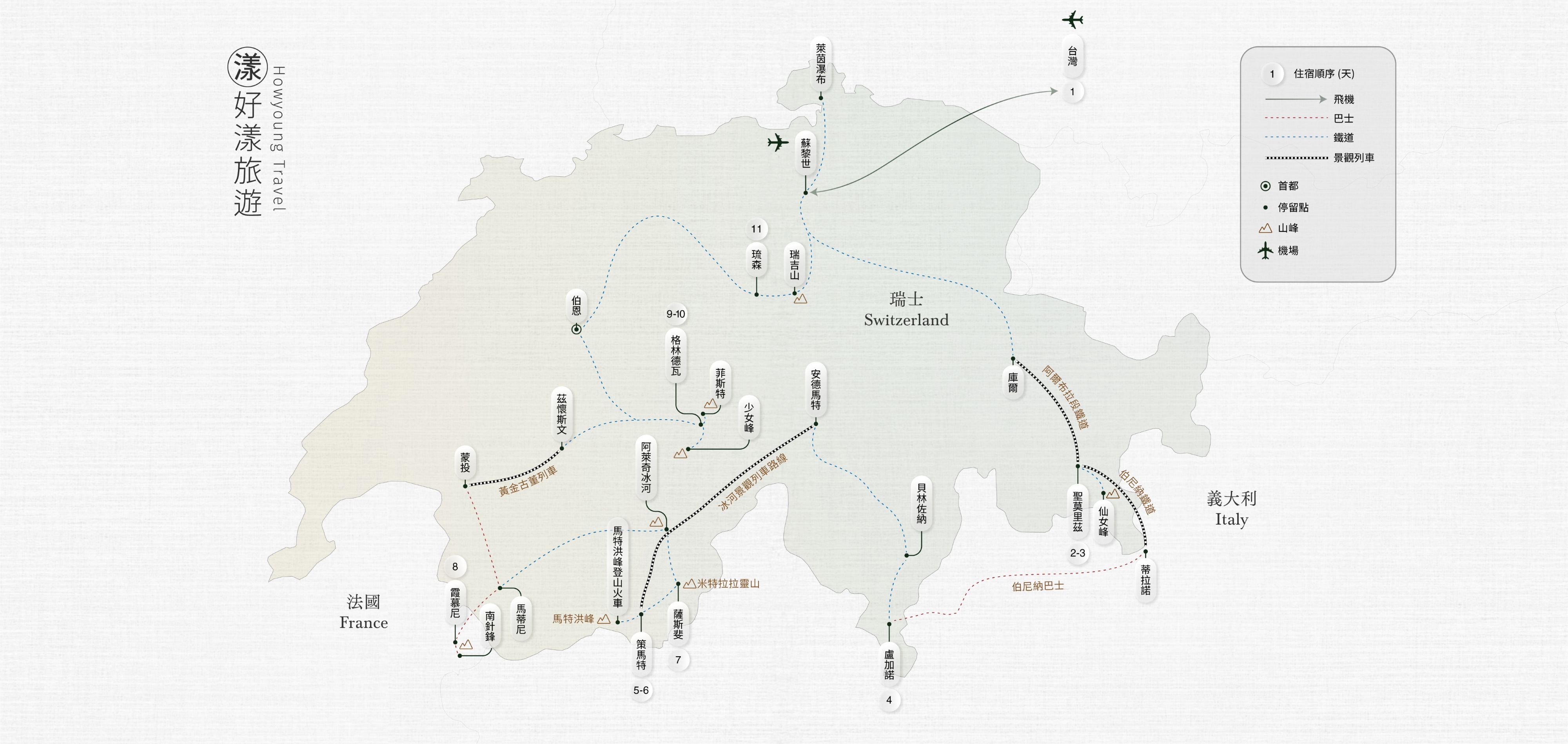 ● 全程火車使用瑞士旅行通行證Swiss Travel Pass預定,如配合鐵道公司調整相關艙等無價差。